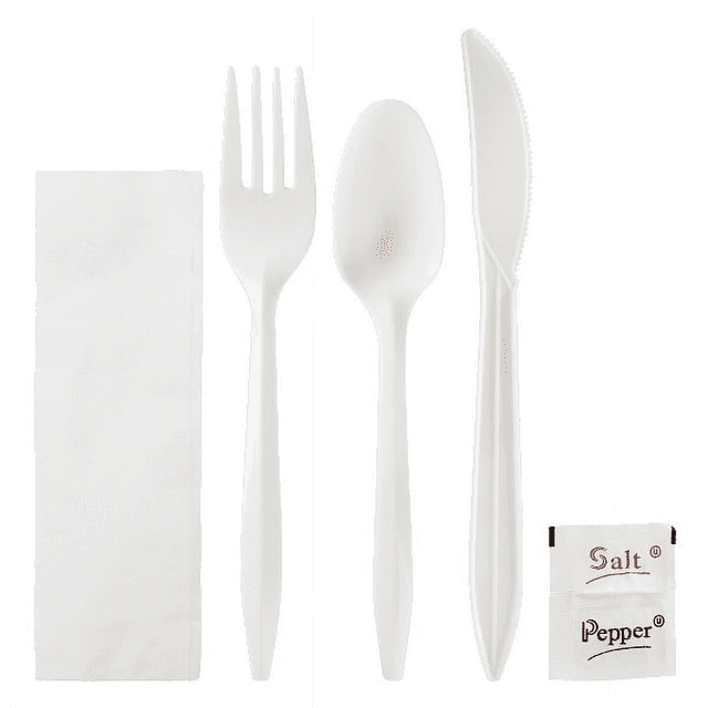 Contains: 1 fork, 1 tea spoon, 1 knife, 1 single ply napkin, 1 salt packet, and 1 pepper packet